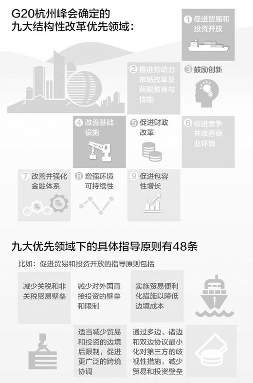 深化结构性改革是G20杭州峰会的一项重要议题。在世界经济深度调整的背景下,结构性改革成为提高生产力和潜在产出的关键。杭州峰会确定了结构性改革的促进贸易和投资开放、推进劳动力市场改革等9大优先领域以及48条指导原则,既提供了结构性改革的中国方案,又描绘了符合各国国情的指导蓝图。