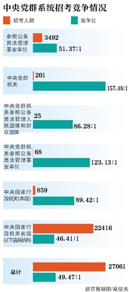 李茜分析,国税系统成报名之最的主要原因还在于该系统招录的人数较多。今年,120多个中央机关及其直属机构和参照公务员法管理的单位参加招录,共计划招录27061人。而国税系统招录人数超过1.7万人,成为最大招录户。