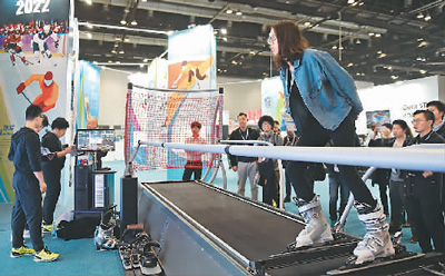 体验式的展览,让更多人感受到冰雪运动的乐趣。在北京冬奥组委的展位,笔者看到,观众正在试用滑雪仿真器,只需穿上滑雪鞋站到“滑雪板”上,随后通过专业的控制面板进行参数调节,就开始滑雪训练了。工作人员向笔者介绍说,在该设备上单板和双板都能使用,训练者可自行选择训练动作,实现精准训练,系统内置了高保真模拟赛道,配合16平方米的大屏幕,训练者可以体验激流回旋和大回转的速滑感受。