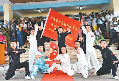 10月24日,中国第四支驻利比里亚维和警察防暴队参加在泛非大厦举行的庆祝联合国成立71周年庆典活动。维和警察们表演了长拳、南拳、太极等传统武术,受到现场观众的好评。