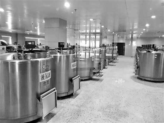 如今,北京市脐血库坐落于大兴亦庄园区内。北青报记者探访时看到,存放脐血的大型液氮罐位于一层,上百个液氮罐被整齐排列,每个罐中可容纳5000份脐血,罐内温度低至零下196℃。非专业人员无法直接接触到液氮罐。