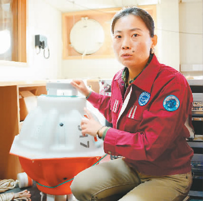 图为航次首席科学家周慧在介绍压力逆式回声仪。