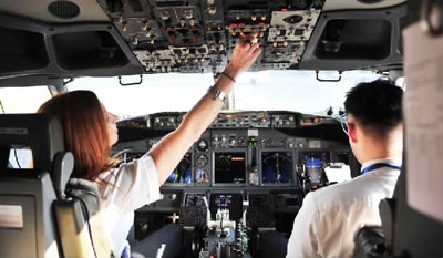 祥鹏航空外籍机长正在做起飞前准备工作。 谢 明摄
