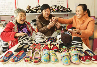 针对社区赋闲妇女较多、为照顾家庭又无法外出打工这一实际,近年来河北省迁安市马兰社区居委会成立了“马兰巧娘工作室”,工作室传承当地家庭织布、手工布鞋、手工鞋垫等工艺,并注册了“马兰巧娘”商标。一开始有30余名家庭妇女参加,目前已帮助数百人实现创业,并带动周边11个村的600余名妇女就业,成为当地家庭妇女增收新途径。图为日前“马兰巧娘”正在制作“千层底”布鞋。