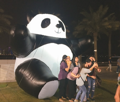 图为卡塔尔民众在充气大熊猫模型下合影。