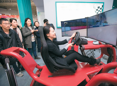11月3日,第十三届“中国光谷”国际光电子博览会在武汉国际博览中心开幕。本届“光博会”以“光联万物,智引未来”为主题,设置了光制造馆、光通信馆、光应用馆、智慧家庭馆4个展馆。图为观众在光应用馆体验赛车模拟器。