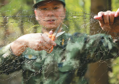 入秋以来,过境上海地区的鸟类数量陆续增加,上海公安边防官兵频繁进行巡视湿地河滩、搜索芦苇草丛以及观察树林岸堤的“夜鹰行动”,救助了许多过境候鸟。图为11月3日,上海东旺沙边防派出所干警剪断捕鸟网具。
