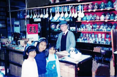 图为1997年,林美虹与外公、姐姐、表姐在永安和店铺。