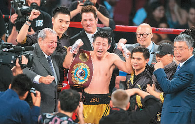 11月5日,在美国拉斯韦加斯举行的WBO(世界拳击组织)蝇量级金腰带争夺战中,中国职业拳手邹市明战胜泰国选手帕波姆,首次夺得WBO蝇量级世界拳王金腰带。图为邹市明(中)在庆祝。
