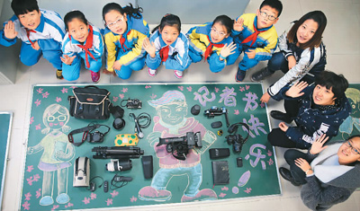 图为海港区工人北里社区工作人员和先盛里小学师生共同搭配摄影器材。