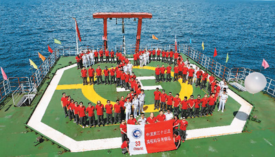 11月8日,中国第33次南极科学考察队所乘的“雪龙”号科考船经过7天航行,由北向南穿越赤道,开始在南半球的航行。图为第33次南极科考队队员和“雪龙”号船员在“雪龙”号停机坪组成“33”字样的队形。