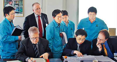 图为钟文君(前排中)向欧盟GMP认证官介绍企业情况。