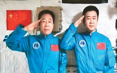 正在天宫二号执行任务的神舟十一号航天员景海鹏、陈冬向习近平、向全国人民行军礼。