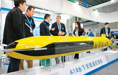 图为工作人员向参观者介绍一款水下无缆遥控潜器。