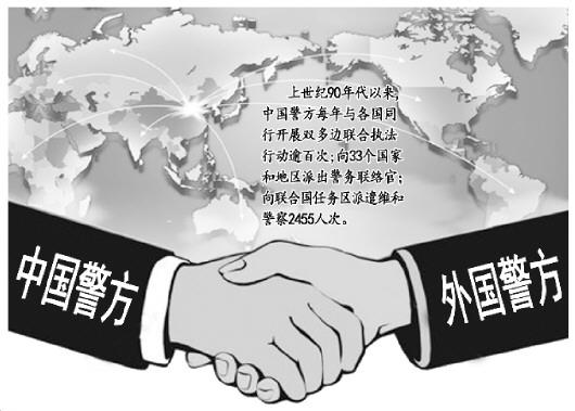 自上世纪90年代以来,中国警方大力发展与世界各国的务实执法合作关系,不断加强同国际刑警组织、联合国、上海合作组织、东盟、欧洲警察署等国际和区域组织的交流合作,每年与各国同行开展双多边联合执法行动逾百次,在反恐、禁毒、网络安全、打击跨国犯罪、追逃追赃等领域扮演重要角色,为维护地区和世界安全与发展发挥着越来越重要的作用。向33个国家和地区派出警务联络官,切实维护广大海外华人华侨和海外游子的切身利益;向联合国任务区派遣维和警察2455人次,成为安理会常任理事国中最大出警国,主动承担了组建首支联合国成建制维和常备警队的任务……中国警察,已日益成为中国向世界展现形象和实力的一张靓丽名片。