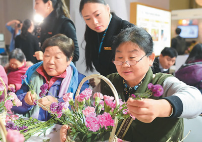 图为一家养老机构工作人员现场教老人插花。