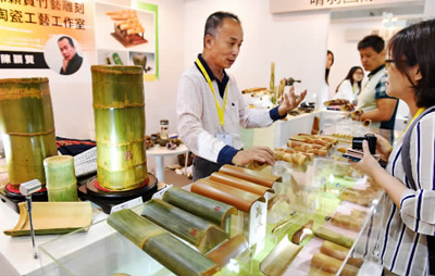 来自台湾的参展商(左)在展会上向客人介绍竹雕工艺品。