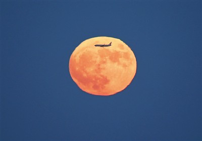 图为当晚,一轮特大金黄色月亮从北京东方升起,一架民航班机正好从月前经过。