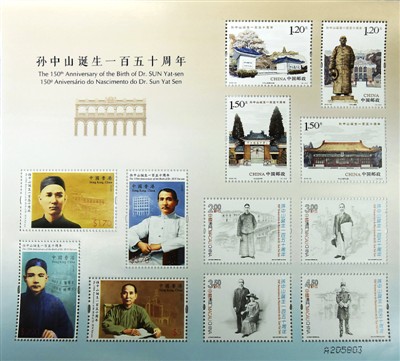 近日,中国邮政与香港邮政、澳门邮政共同发行《孙中山诞生一百五十周年》纪念邮票同题材邮票小全张1枚,内含中国邮政、香港邮政、澳门邮政邮票各4枚。