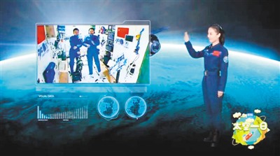 11月17日,新华社太空特约记者、航天员景海鹏(左二)、陈冬(左一)与地面上的航天员王亚平(右一)一起为全国青少年小朋友录制的一堂“太空科普课”上线播出。