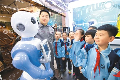 11月17日,河北香河县城内第四小学开展主题活动。老师带领孩子们来到当地的机器人产业园,与各式机器人“亲密”互动。图为一名学生正通过屏幕与机器人挥手“交流”。
