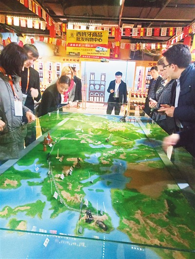 11月15日,在义乌国际商贸城五区进口商品馆的西班牙商品中心,德国法兰克福汇报记者裴珂珑和多国同行,盯着一个沙盘反复看,寻找自己家乡的位置。这个沙盘展示的是“义新欧”中欧班列路线图。