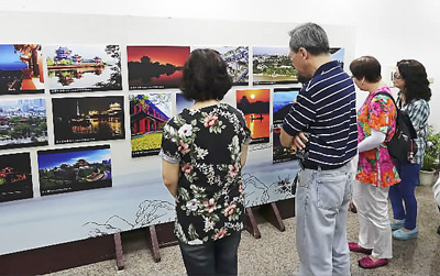 图为两岸嘉宾参观中华历史名楼文化图片展。