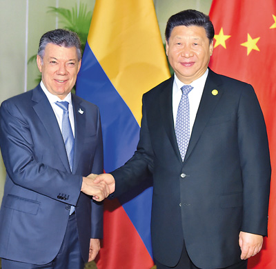 习近平指出,中方赞赏并支持桑托斯总统坚定推进哥伦比亚和平进程。中方从战略高度和长远角度看待和发展同哥伦比亚关系,愿同哥方一道,落实双方合作共识,推动中哥关系迈上更高台阶。当前,中哥都处在国家建设关键时期,双方要相互支持、相互帮助,加强高层交往,保持密切沟通,鼓励和支持两国政府、立法机构、政党等往来。要扩大务实合作,加大推动重点项目力度,积极开展产能合作,实现互利双赢、共同发展。要加强多边合作,推动国际秩序朝着更加公正合理的方向发展。