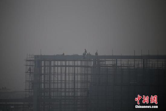 11月18日,河南郑州遭遇雾霾袭击,在脚手架上的建筑工人置身灰度空间。近期,中国多地雾霾齐发,许多城市发布雾和霾预警,城市进入朦胧模式。18日华北黄淮等地迎本轮雾霾最重时段,京津冀等六省份局部有重度霾。中新社记者 王中举 摄