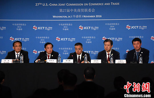 当地时间11月23日,中国商务部国际贸易谈判副代表张向晨(中)就第27届中美商贸联委会的情况向媒体吹风。中新社记者 刁海洋 摄