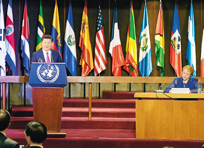 习近平抵达时,受到巴切莱特及联合国拉丁美洲和加勒比经济委员会执行秘书巴尔塞纳等热情迎接。巴尔塞纳欢迎习近平到访联合国拉丁美洲和加勒比经济委员会并出席中拉媒体领袖峰会开幕式。