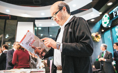 智利“中国主题图书展销月”活动十一月二十三日在智利首都圣地亚哥开幕。图为一名参观者在阅读。