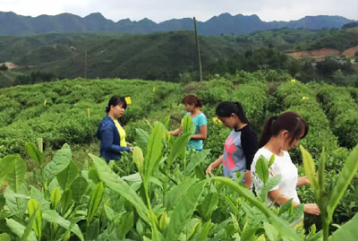 图为邓燔(左一)带领学生到当地茶园进行调研,强调学生做学术和实践要结合起来,不能单纯读书本知识。