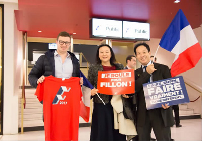 图为在法华人田玲(中)、郭义(右)在共和党竞选人弗郎索瓦·菲永竞选会上。