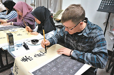 选修这堂书法课的,除了芬兰的空山,大部分是来自马来西亚的留学生。他们是北京语言大学汉语学院的高年级本科生,对中国传统书法有浓厚的兴趣。虽然有的还不太习惯毛笔的握笔方式,有的还无法自如地控制笔锋的走向,但个个都兴致勃勃地认真书写着。利雅娜是班上写得最好的同学之一,她用很标准的姿势握着笔,腕力稳健、笔顺准确,写出的字大气端正。看着她的字,不会想到是出自外国人之手。“我从大二时开始接触中国书法,我的愿望是成为一名汉语教师,所以我觉得写一手漂亮的汉字很重要。中国的书法太美了,我会一直学下去。”利雅娜说。