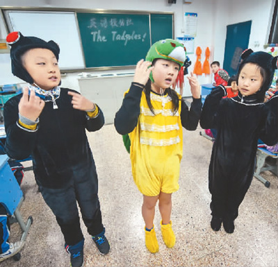 图为孩子们在表演刚刚排练好的英语舞台剧《小蝌蚪找妈妈》。