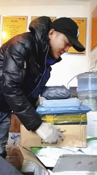11月23日晚上8点,在位于伊宁市利群路的韵达快递经典花园店,快递员们正将一天没送递完的快件进行分类、将要发送的货物打包。正是下班高峰期,附近小区前来取包裹的人络绎不绝,“双十一”后的包裹堆积如山。包裹堆中,25岁的快递员张星,取货、打包,灵活地在缝隙中穿行。