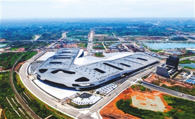 城市音乐厅还处于开工建设阶段,但成都西部国际会议展览中心却已接近工程尾声,显露出宏伟的气势和优美的造型。从高空俯瞰,西部国际会议展览中心呈“V”字型;走近看,它的正面设计如大海中的波浪,又如山峦,连绵起伏,造型优美。