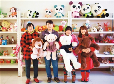 图为村民展示他们在当地一家“扶贫车间”内制作的毛绒玩具。
