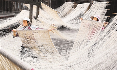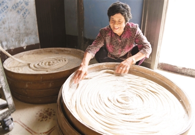 台湾彰化县福兴乡一些人家还保留着手工制作面线传统。纯手工面线制作要经过醒面、盘条、拉面、上架、甩面、晾晒等多道工序,面细如丝,富有弹性。 图为11月29日,村民在制作面线。