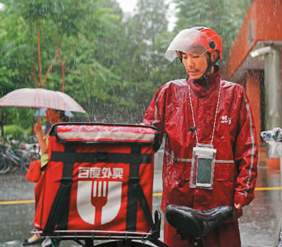 7月20日,北京暴雨,百度外卖送货员陈琦准时将午饭送达目的地。