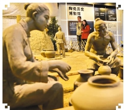 游客在张家口宣化的国玉陶瓷有限公司的陶瓷博物馆参观。