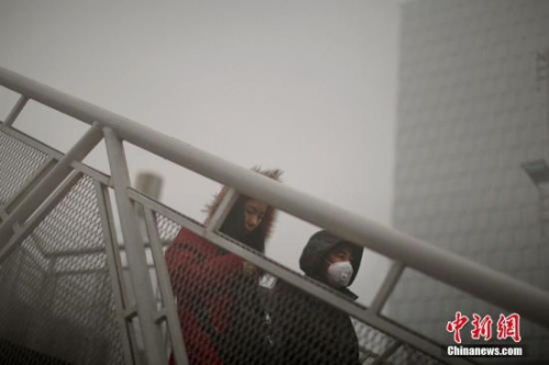 12月4日,戴着口罩的行人从天桥上走过。天津市气象台当日7时发布大雾橙色预警信号,天津大部分地区笼罩在大雾中,局部地区能见度低于200米。 中新社记者 佟郁 摄