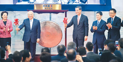 12月5日,港交所举行“深港通”开通仪式,香港特区行政长官梁振英(右三)和港交所主席周松岗(左二)共同为当日首笔交易鸣锣开市。