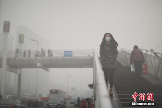 资料图:12月4日,戴着口罩的行人从天桥上走过。天津市气象台当日7时发布大雾橙色预警信号,天津大部分地区笼罩在大雾中,局部地区能见度低于200米。 中新社记者 佟郁 摄