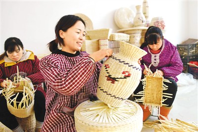 近年来,河北省柏乡县固城店镇固南村村委会引导农民将玉米秸秆、玉米皮“变废为宝”,加工制作手提袋、坐墩、储物架、茶几等草编工艺品。目前,固南村有100多人从事草编工艺品制作,年产值可达500万元。图为固南村村民在制作草编工艺品。