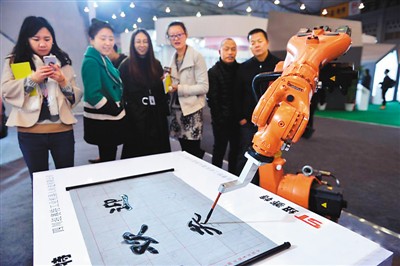 在2016成都创意设计周上,一台会写书法的机器人受到观众的关注。