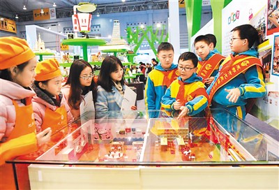 在2016成都创意设计产业展览会上,来自成都市龙泉驿区第五小学的学生为参观者讲解他们参与设计的校园模型。
