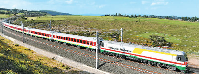 在埃塞俄比亚首都亚的斯亚贝巴附近,一列火车在由中国企业建设的亚吉铁路上行驶。