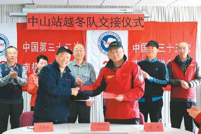 12月10日,在中国南极中山站,第33次南极科考中山站队员与第32次南极科考中山站越冬队员举行新老队员交接仪式。
